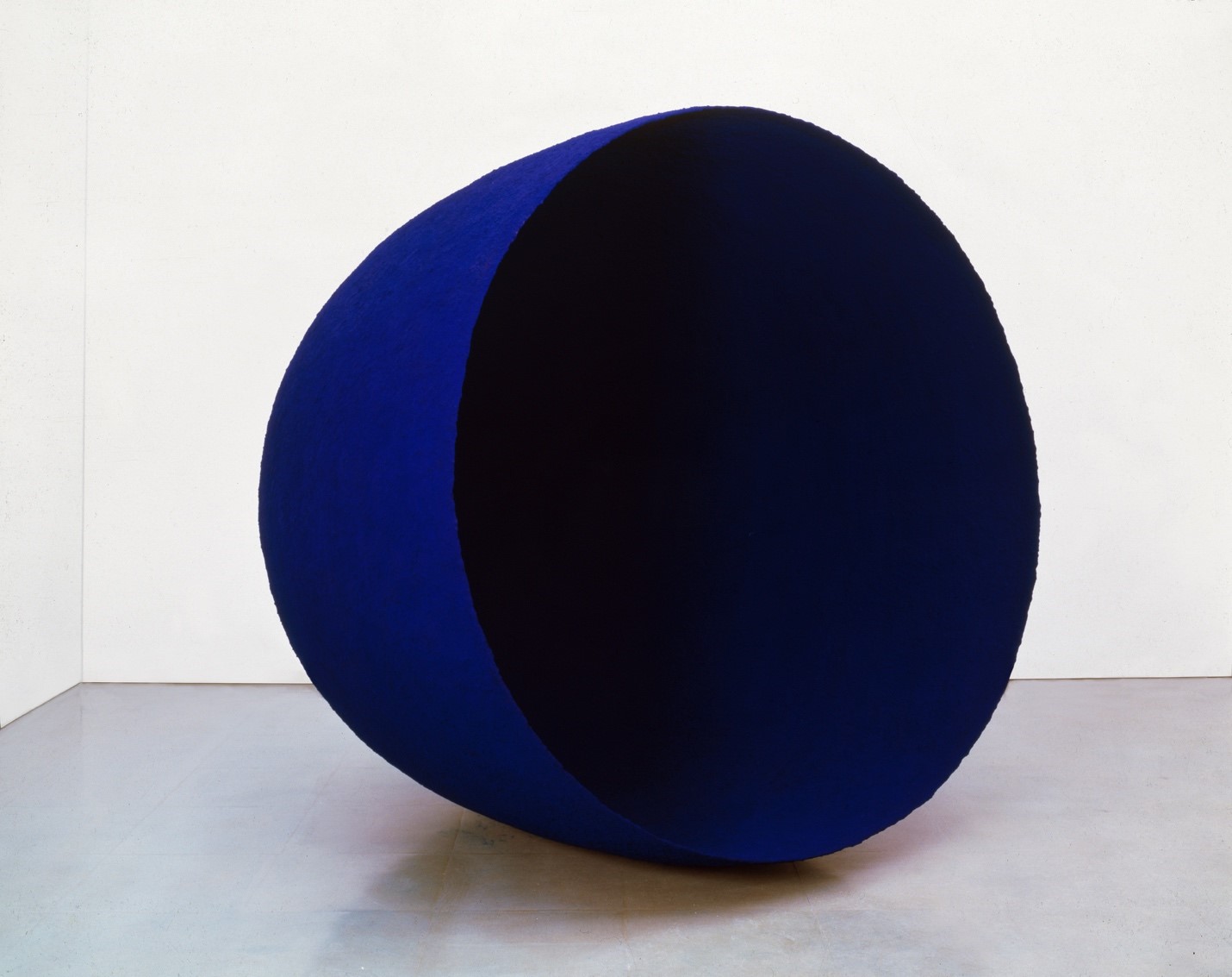 Kapoor’s Mother as a Void (1988) is, in my judgement, such a work. This sculptural piece—roughly 6.5 feet cubed, made of fiberglass, covered in cobalt blue pigment—is a kind of hollowed-out, intact half-eggshell. Spheroidal and slightly larger than the average person, the viewer cannot get an encompassing view of the work, which appears dramatically different from different angles. From its back or closed side, the work appears a deep blue orb and is thus suggestive of the Earth (mother), a subject of several Kapoor works. We are being given a view of the world, as if we are removed from or above it, in some kind of transcendental point of view. Almost oppositely, however, because our upright position makes it difficult to see the orb’s base, it appears almost to float just above the floor, making this world seem to transcend our own. Of course, we and this blue fiberglass object both exist in the same (real) world, but Kapoor’s piece is altering how we experience and so think the latter.