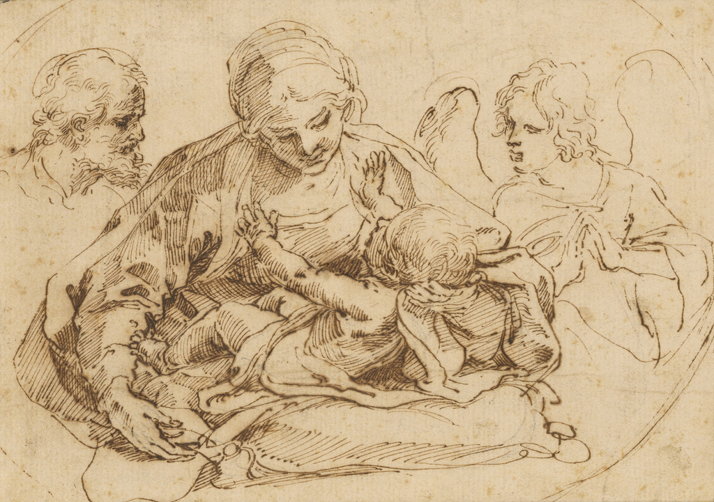 On the left, a sepia-toned sketch of a woman, her arms bent at the elbows and wide before her chest. She cradles a plump infant whose own arms reach out toward her, hands open (like his mouth) in a gesture of desire. The woman gazes tenderly at the infant, her left hand cupping his head, her right hand supporting the generous yards of fabric that fold over and around both bodies together. To the viewer’s left and over the woman’s right shoulder hovers an older man. To the viewer’s right and behind the woman’s left shoulder is an angel. Both man and angel look, too, upon the infant—the man through eyes set deep in his wizened face, the angel with hands clasped in prayer. Both figures are only lightly indicated, their forms hinted at by the barest of outlines. The woman and infant are, by contrast, sketched in considerably more detail. Centered on the paper, these two figures are larger, darker, and more intricately enfigured. Guido Reni’s sixteenth-century Holy Family with an Angel is, if nothing else, a portrait of a romance between mother and son.